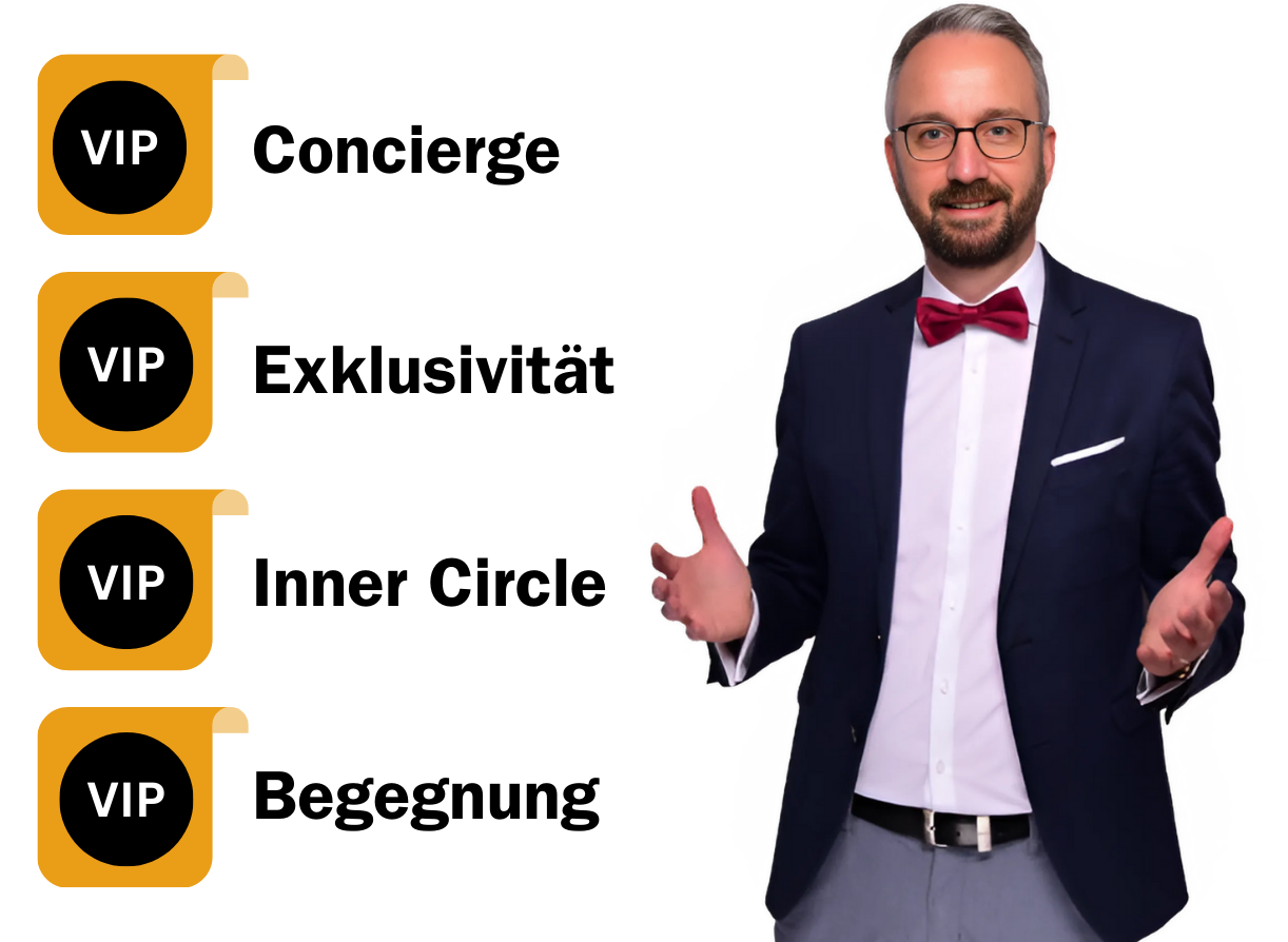 Als VIP erhältst du individuellen Zugang, tiefe Einblicke und persönliche Begleitung. Eine handverlesene Community sowie exklusive Gruppentreffen schaffen einen Rahmen für anspruchsvolles Networking auf Augenhöhe.